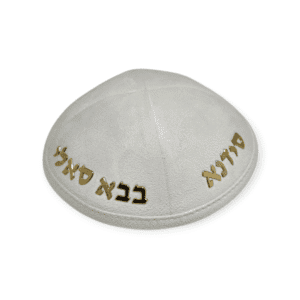 כיפה קטיפה לבנה עם מדבקה בבא סאלי בזהב 4468323