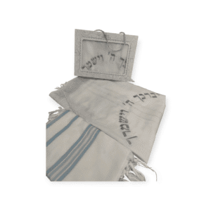 סט לתינוק הכולל: טלית ילדים רקומה פסים תכלת, תהלים סיכה לעגלה, כיפה עם שרוך לקשירה