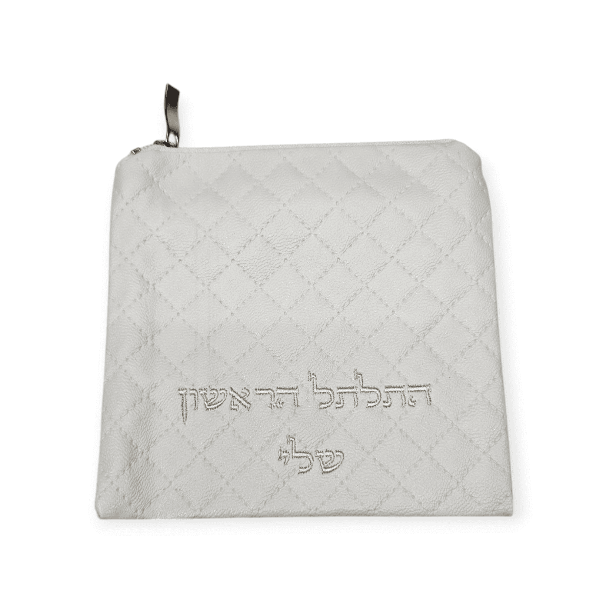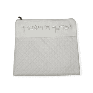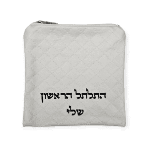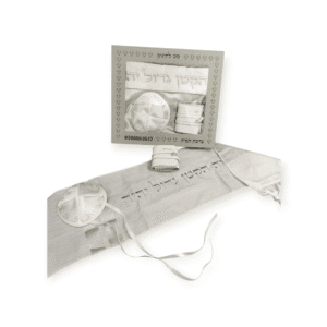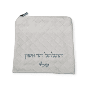 סט לתינוק הכולל: טלית ילדים רקומה פסים כסופים,תהלים, סיכה לעגלה, כיפה עם שרוך לקשירה