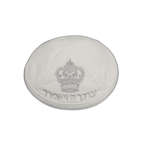 כיפה קטיפה לבנה ילדים עם רקמת כתר בכסף 14 ס”מ